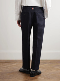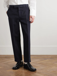 American tailor Thom Browne is world-renowned for his cropped cuts and uniform-style aesthetic. Easy to style with one of the label's polos or collared shirts, these tapered 'Utility' trousers are made from navy cotton-twill and garment-dyed for softness. Size & Fit - Size 0 = W28, 1 = W30, 2 = W32, 3 = W3 4, 4 = W36 and 5 = W38 - Fits true to size. Take your normal size - Tapered leg, mid-rise style - Cropped length - Mid-weight, non-stretchy fabric - Model is shown wearing a 1 - Model measures: waist size 30, height 6'2"/ 188cm Details & Care - Navy cotton-twill - Hook and zip fastening - 100% cotton - Dry clean