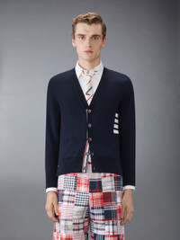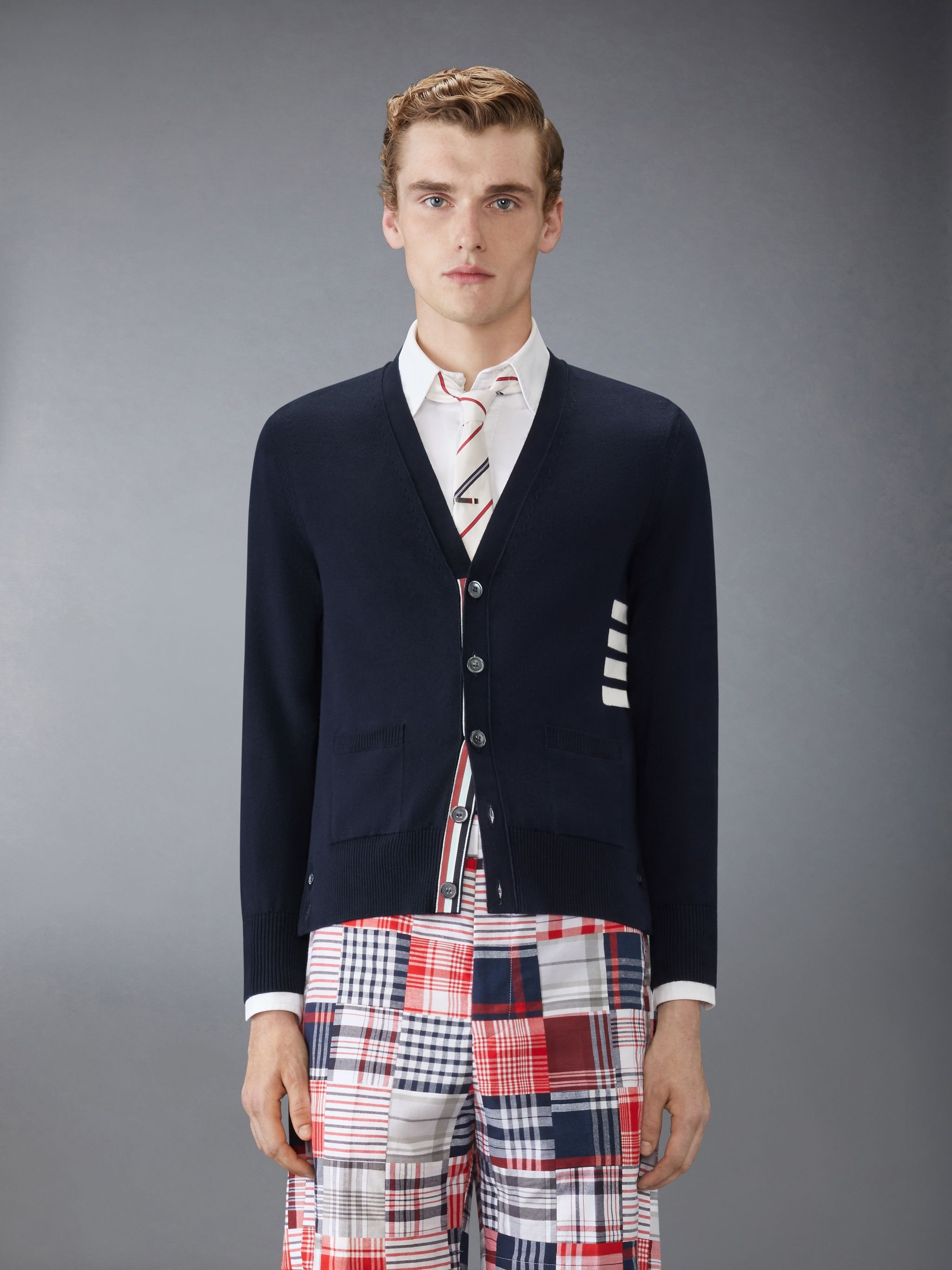 DETAILS & FIT Keep warm this season with this luxe cardigan crafted in fine cotton fabric. V neckline Front button closure with striped grosgrain placket 4-bar detailing Buttoned side vents with signature striped grosgrain trim Buttoned cuffs with signature striped grosgrain trim Signature striped grosgrain loop tab Model is 6'1" (185cm), wearing size 1 100% Cotton Made in Italy MKC581A-Y3043-415