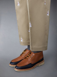 DETAILS & FIT Mid top deck shoe in cognac and navy vacchetta leather with pale crepe sole. Leather lace up closure at grommeted metal eyelets, brogued apron toe with self-piping details, stitched welts. Signature striped grosgrain loop tabs at heels. Upper:100% Calf Leather Sole:100% Rubber Lining:100% Calf Leather Made in Italy MFD246BL0044275 - HEEL: 3.0cm - HEIGHT: 10.0cm - Sole height: 1.5cm