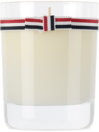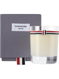Scented wax candle. Crystal glass vessel with tricolor grosgrain trim. - Top notes: cypress oil orpur, eucalyptus absolute, hazelnut accord - Heart notes: walnut accord, orris butter orpur, mezquite wood accord - Base notes: Thom Browne's Vetyver Blend, latigo leather accord, oakmoss absolute - Cotton wick - Burn time: 20 hrs - H3.75 x D3 / 175 g