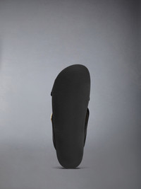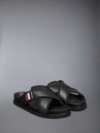 Criss cross strap loafer sandal in black vitello calf leather with enameled stripe plaque detail at outer strap. Tonal leather sole with rubber outsole. Upper: 100% Calf Leather Sole:100 % Microporous Lining:100% Calf Leather Made in Italy MFL093A-05584-001
