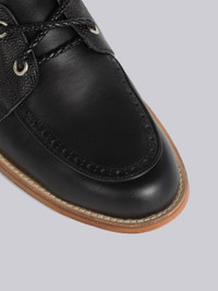 DETAILS & FIT Boat show in black vitello leather with tonal pebble grain leather detailing. Woven tonal leather lacing, perforated broguing through toe, stacked flexible natural leather sole. Signature striped grosgrain loop tab at heels. Upper: 100% Calf Leather Sole: 100% Calf Leather Lining: 100% Calf Leather Made in Italy MFD251A05584001 - HEEL: 3.0cm - Sole height: 1.0cm