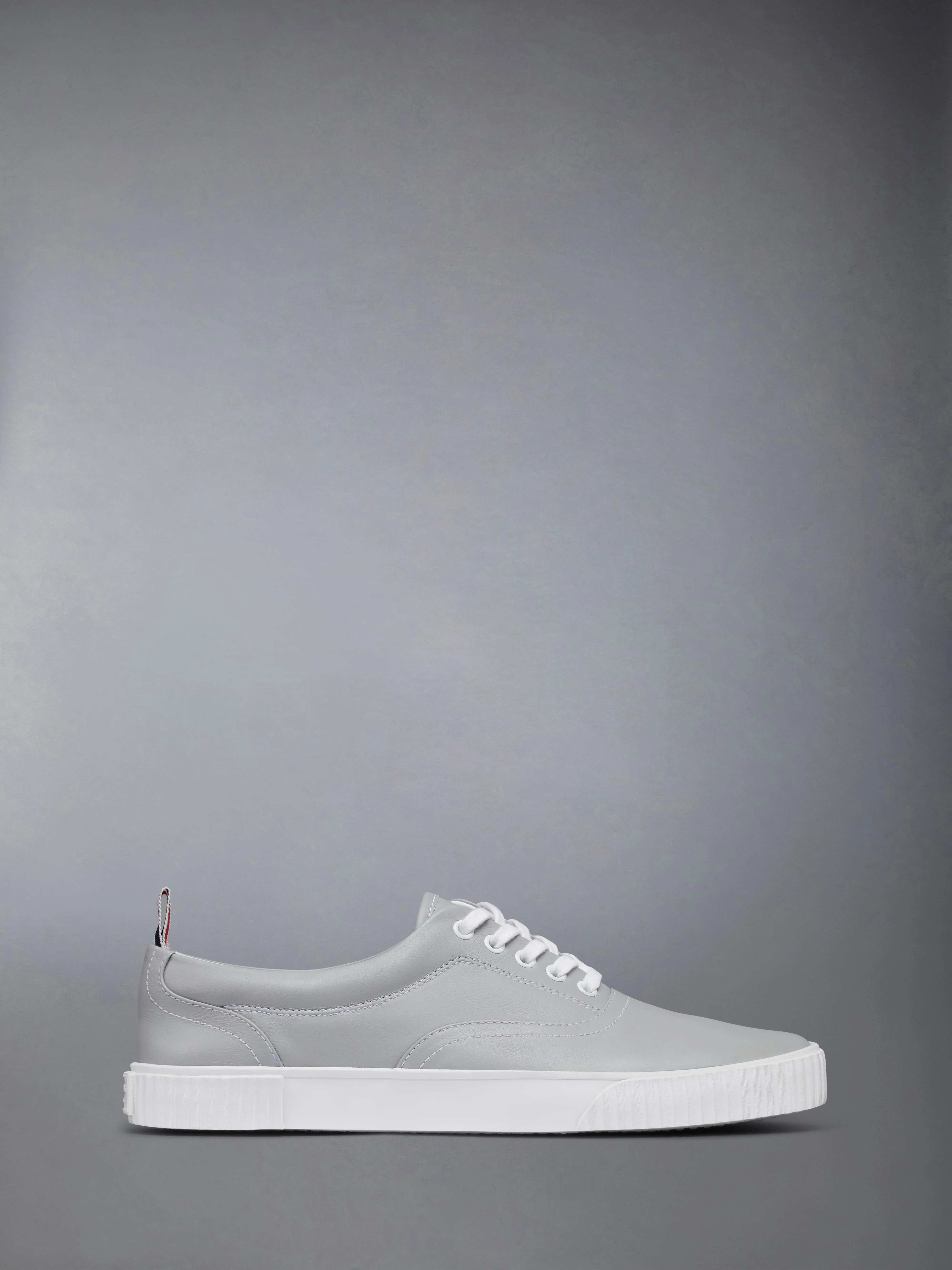 DETAILS & FIT Leisurewear made artful. These crisp trainers were inspired by Thom's passion for sport. Lace up closure Rubber sole Leather lining Signature striped grosgrain loop tabs Upper: 100% Calf Leather Sole: 100% Rubber Lining: 100% Calf Leather Made in Italy MFE007B-05584-055