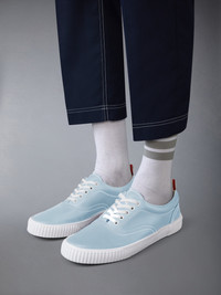 DETAILS & FIT Leisurewear made artful. These crisp trainers were inspired by Thom's passion for sport. Lace up closure Rubber sole Leather lining Signature striped grosgrain loop tabs Upper: 100% Calf Leather Sole: 100% Rubber Lining: 100% Calf Leather Made in Italy MFE007B-05584-480
