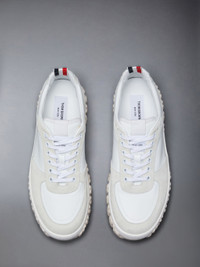 DETAILS & FIT Leisurewear made artful. These shoes were inspired by Thom's passion for sport. Braided rubber soles are an innovative touch on crisp trainers. Lace up closure Braided rubber sole Leather lining Signature striped grosgrain loop tabs Combo1: 100% Calf Suede Split Leather Upper: 100% Calf Leather Sole: 100% Rubber Lining: 100% Calf Leather MFD277A-05584-107