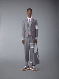 DETAILS & FIT A timeless silhouette in classic grey, emblazoned with a signature Thom Browne emblem at the back. V-neckline Front button closure with signature striped grosgrain placket Front slip pockets Signature striped grosgrain trim at back Signature striped grosgrain loop tab Model is 6' 1" (185cm), wearing size 1 100% Virgin Wool Made in Italy MKA518A-Y1029-055