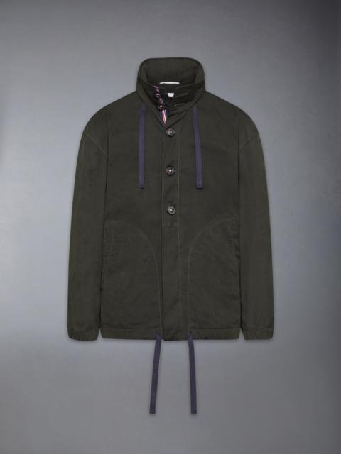 This water-repellent anorak features a removable hood, delivering adaptable protection against rain and wind. Crafted from waxed tech fabric, it catches the light with a subtle sheen—elevating its utilitarian roots into a statement of modern sophistication. A drawstring hem offers a customizable fit, while grosgrain trim at the buttons adds a signature Thom Browne touch. Navigate shifting weather with impeccable taste. Front button closure with striped grosgrain placket Removable hood Slip side pockets Drawstring hem Signature striped grosgrain loop tab Model is 6'1" (185cm), wearing size 1 45% Cotton, 39% Polyester, 16% Polyamide Combo 1: 100% Polyester Made in Italy MJO240C-F0923-350