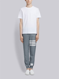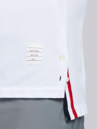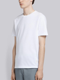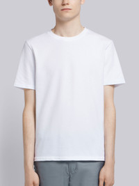 DETAILS & FIT A silhouette that has stood the test of time, our Classic Pique Stripe Tee is adorned with signature Thom Browne emblems and tailored to perfection. Crew neckline Name tag applique above hem Center back stripe detail Buttoned side vents with signature striped grosgrain trim Signature striped grosgrain loop tab at back of neck Model is 6' 1" (185cm), wearing size 0 100% Cotton Made in Italy MJS056A-00050-100