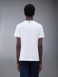 DETAILS & FIT A silhouette that has stood the test of time, our Jersey Relaxed Side Slit Tee is enriched with a breathable side slit and Thom Browne emblems throughout. Bound Crew neckline Name tag applique above hem Shallow side slits Signature striped grosgrain loop tab at back of neck Model is 6' 1" (185cm), wearing size 0 100% Cotton Made in Japan MJS067A-00042-100 - CHEST: 99.0cm - Shoulder Width: 40.0cm