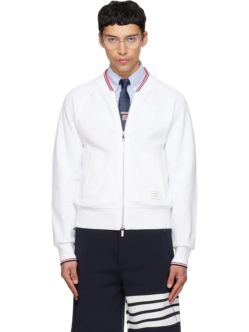 French terry sweater. · Rib-knit stand collar, hem, and cuffs · Stripes at collar and cuffs · Two-way zip closure · Welt pockets and logo patch at front · Tricolor grosgrain flag at back collar Supplier color: White 100% cotton. Made in Japan 261381M202008