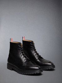 DETAILS & FIT Crafted with the highest quality of classic shoemaking, these classic Apron Stitch Boots are a staple in Thom Browne's legacy. Lace up closure Commando rubber sole Signature striped grosgrain loop tabs at heels Upper: 100% Calf Leather Lining: 100% Calf Leather Sole: 100% Rubber MFB236B-06764-001