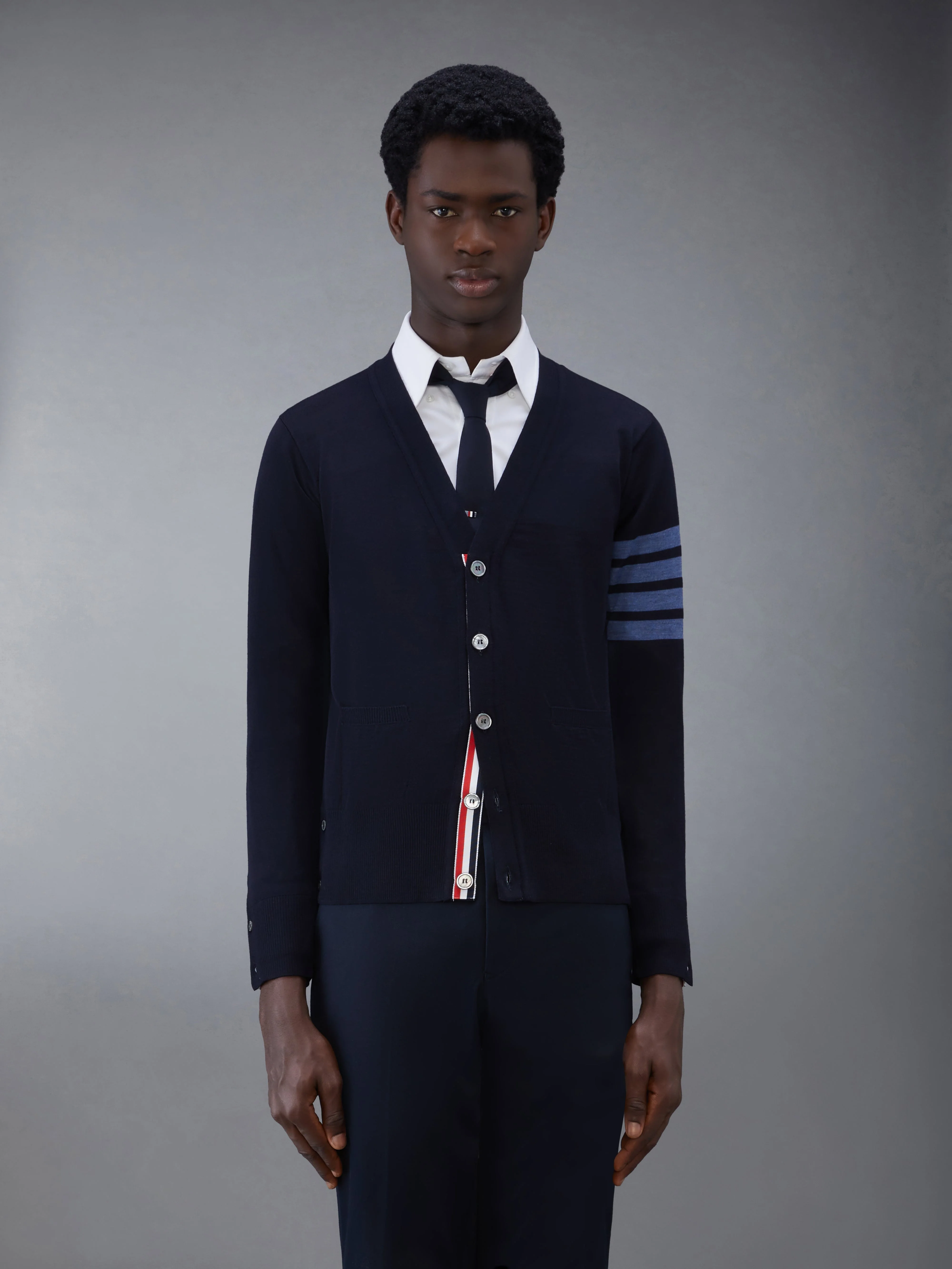 DETAILS & FIT Two Thom Browne emblems define our Wool 4-Bar V-neck Cardigan —grosgrain trim and 4-Bar stripe detailing, both synonymous with the brand. Presented in fine merino fabric, this cardigan exudes sophistication. V-neckline Front button closure with striped grosgrain placket 4-bar stripe detail at left sleeve Slip Front pockets Buttoned side vents and cuffs with signature striped grosgrain trim Signature striped grosgrain loop tab at back of neck Model is 6' 1" (185cm), wearing size 1 100% Virgin Wool Made in Italy MKC002B-Y1014-415
