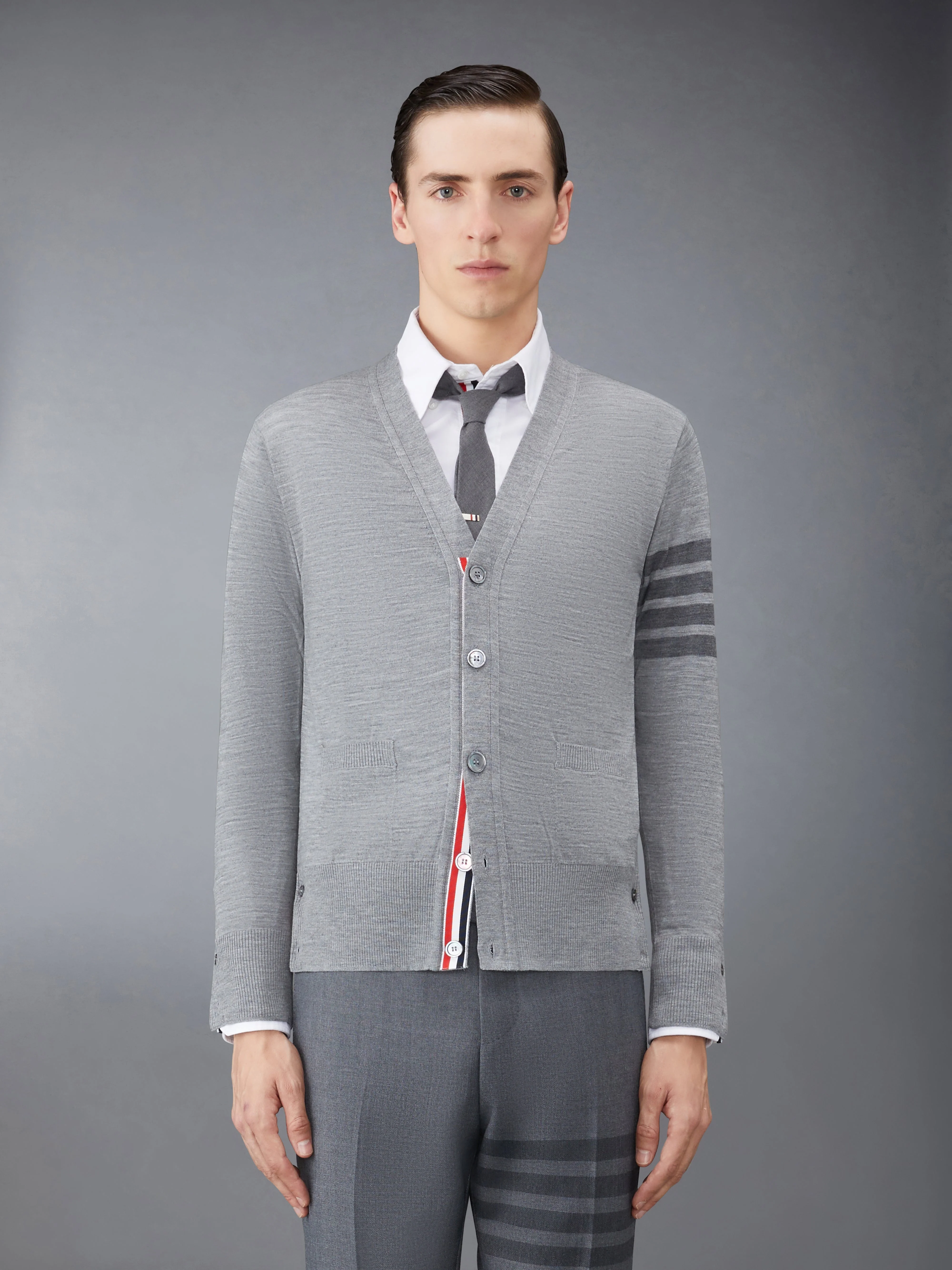 DETAILS & FIT Two Thom Browne emblems define our Wool 4-Bar V-neck Cardigan —grosgrain trim and 4-Bar stripe detailing, both synonymous with the brand. Presented in fine merino fabric, this cardigan exudes sophistication. V-neckline Front button closure with striped grosgrain placket 4-bar stripe detail at left sleeve Slip Front pockets Buttoned side vents and cuffs with signature striped grosgrain trim Signature striped grosgrain loop tab at back of neck Model is 6' 1" (185cm), wearing size 1 100% Virgin Wool Made in Italy MKC002B-Y1014-055