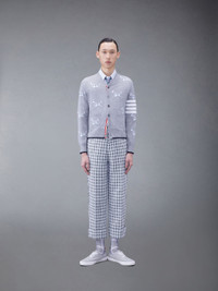 DETAILS & FIT A signature Thom Browne emblem defines this classic cardigan — iconic 4-Bar stripes, synonymous with the brand. Presented in luxe virgin wool, this cardigan is a longstanding staple. Heralded as the most famous dog muse in fashion, Thom Browne’s very own dachshund Hector served as the inspiration behind this quintessential piece. V-neckline Front button closure Striped grosgrain placket 4-bar detailing Front patch pockets Buttoned cuffs with signature striped grosgrain trim Signature striped grosgrain loop tab Model is 6' 1" (185cm), wearing size 1 99% Virgin Wool, 1% Polyamide MKC511A-Y1002-055