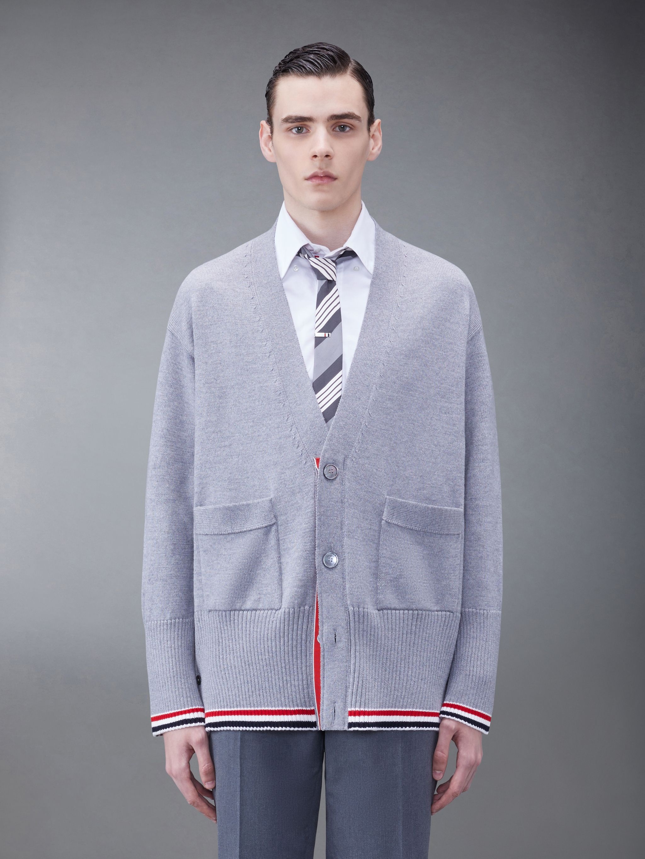 DETAILS & FIT This cardigan exudes sophistication. Wear it in place of an overcoat on warmer days or as an added layer on cooler nights. V-neckline Front button closure Striped grosgrain placket Front patch pockets Buttoned cuffs with signature striped grosgrain trim Button side vents with signature striped grosgrain trim Signature striped grosgrain loop tab Model is 6' 1" (185cm), wearing size 1 100% Virgin Wool MKC516A-Y1003-055