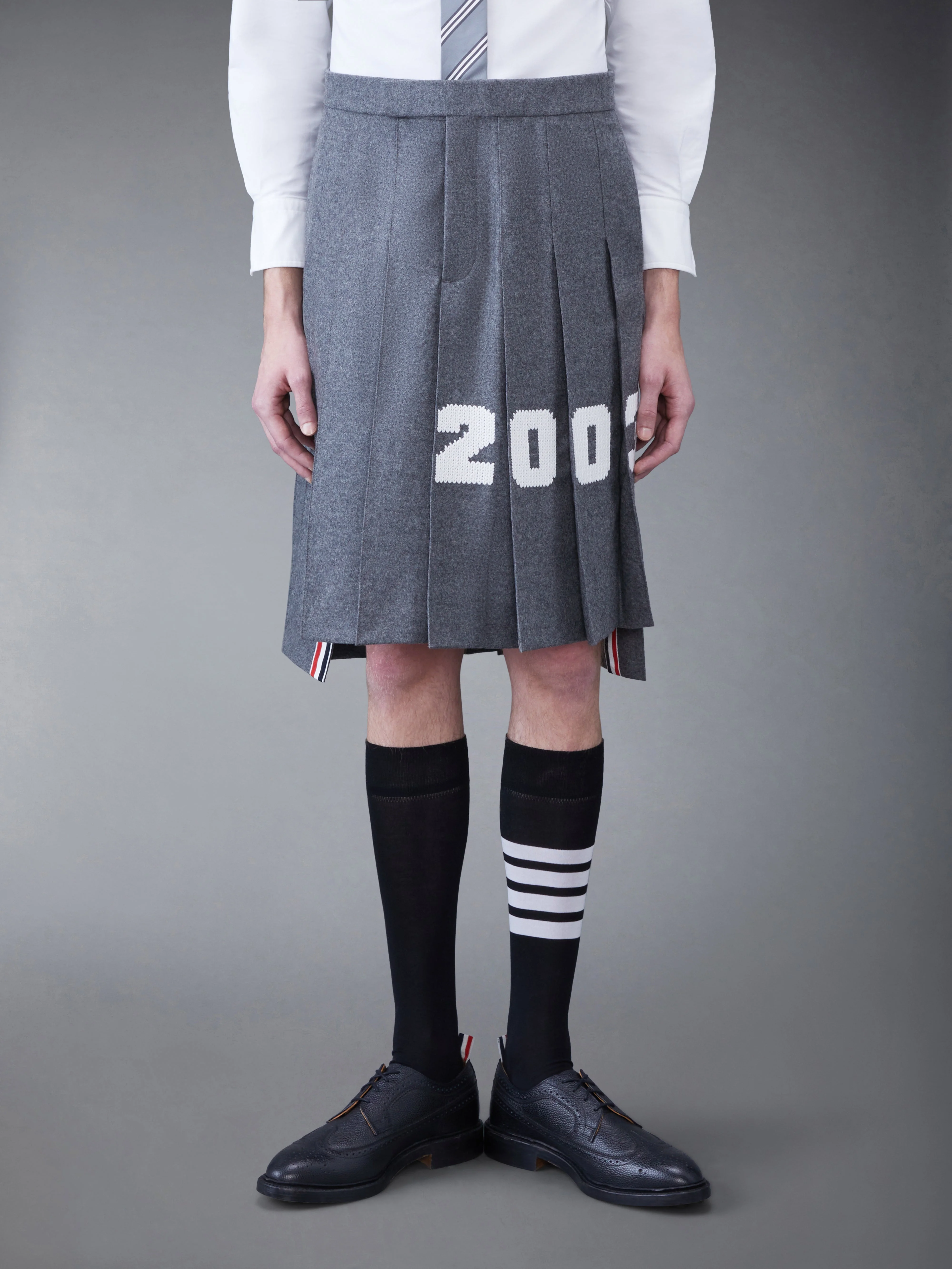 DETAILS & FIT Classic backstrap pleated skirt in grey wool flannel with '2003' V-stitch embroidery through front in white. Tab front closure, dropped back with signature striped grosgrain trim. Adjustable buttoned backstrap. Signature striped grosgrain loop tab at back waist. Classic - Fit 1. Model is 6' 1" (185cm), wearing size 0 100% Virgin Wool Combo 1: 100% Polyester Lining: 100% Cupro Made in Italy MGC019E-E0695-035