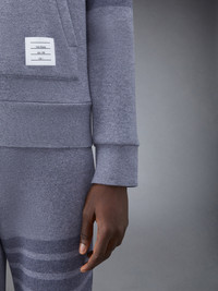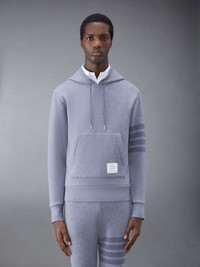 Hoodie pullover in grey wool loopback with tonal engineered 4-bar stripe detail at left sleeve. Drawstring hood with silver tone metal aglets, name tag applique above hem. Signature striped grosgrain loop tab at back of neck. Model is 6' 1" (185cm), wearing size 0. 100% Virgin Wool Made in Italy MJT390AJ0088055 MJT390A-J0088-055