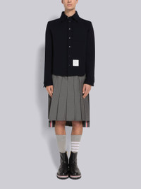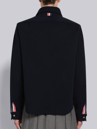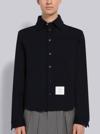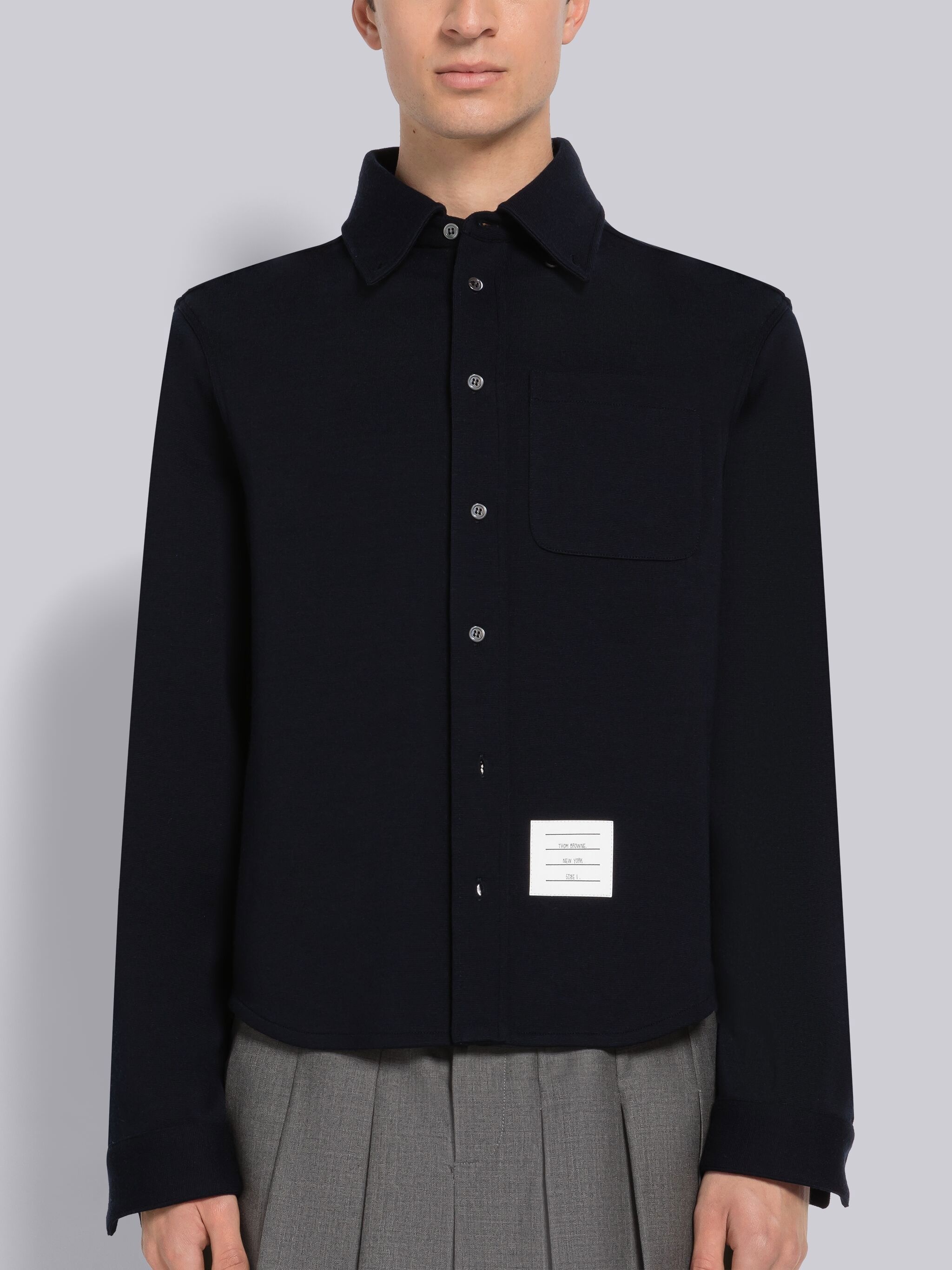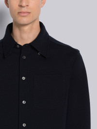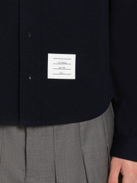 DETAILS & FIT Button down shirt in navy wool Milano. Front button closure, button down point collar, name tag applique above shirttail hem. Buttoned cuffs with signature striped grosgrain trim. Pleated back yoke. Signature striped grosgrain loop tab at back of neck. Model is 6' 1" (185cm), wearing size 1. 100% Virgin Wool Made in Italy MJS194AJ0020415