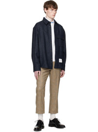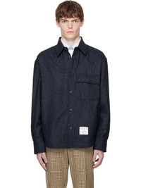 Wool tweed shirt. · Spread collar · Button closure · Flap pocket at chest · Logo patch at front hem · Shirttail hem · Buttoned barrel cuffs · Tricolor grosgrain flag at back collar · Locker loop and pleats at back yoke Supplier color: Navy 100% wool. Made in Italy 252381M192016