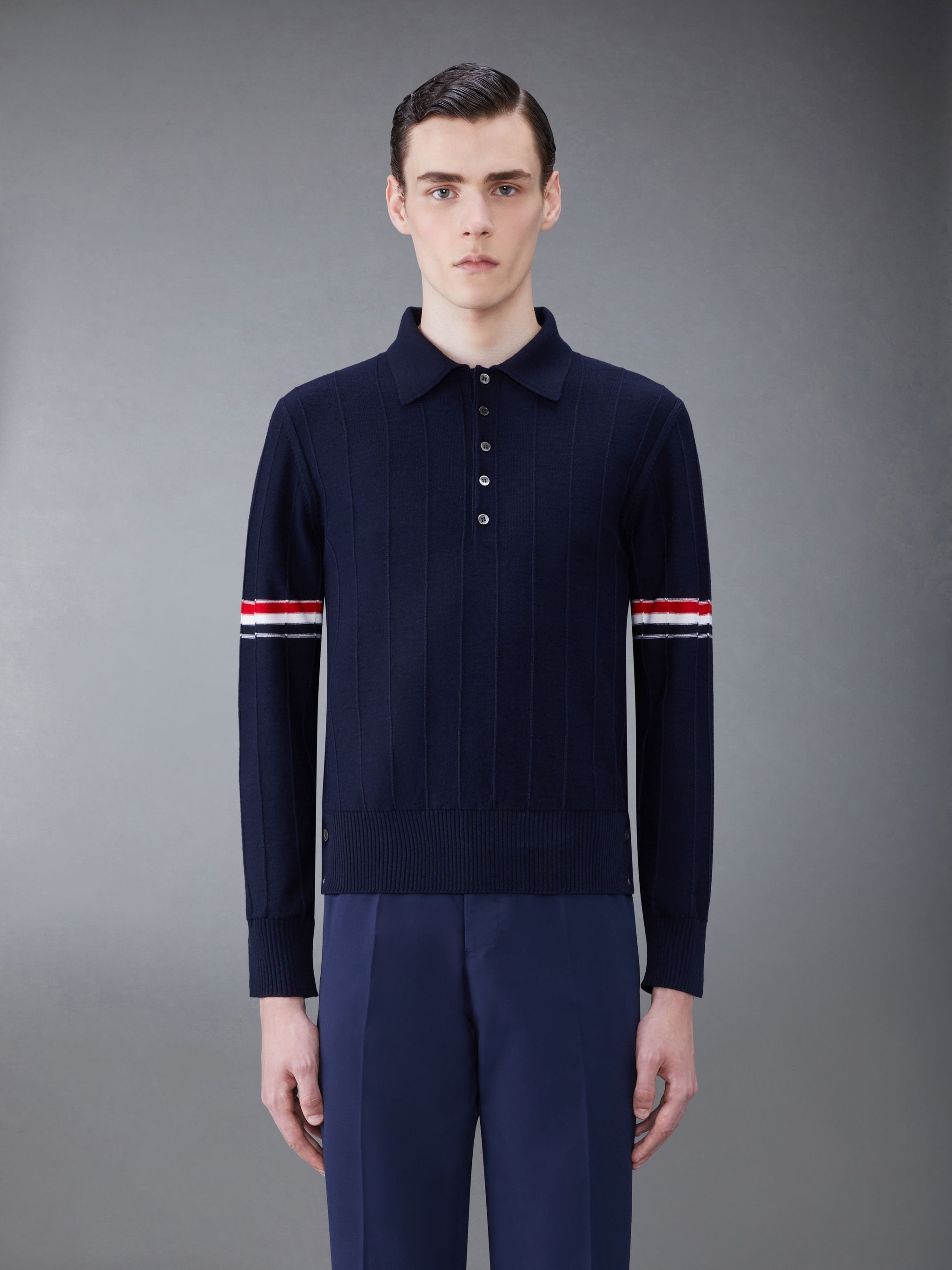 DETAILS & FIT Inspired by East Coast preppy icons, this polished polo is a sophisticated take on a classic silhouette. Partial front button placket Spread polo collar Button side vents with signature striped grosgrain trim Button cuffs with signature grosgrain trim Signature striped grosgrain loop tab Model is 6' 1" (185cm), wearing size 1 100% Virgin Wool MKP108A-Y1002-415