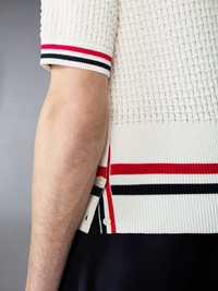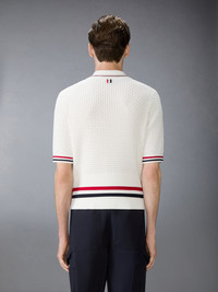 Knit in high-twist cotton with a float ripple stitch, this polo features an airy, architectural surface that plays with texture and depth. The lightweight construction makes it ideal for layering through changing seasons—wear under the Cotton Suiting Armband Unconstructed Sport Coat for a sharp interplay of structure and texture. Partial front button closure Ribbed collar with RWB tipping Engineered RWB stripe at cuffs and hem Buttoned side vents with RWB grosgrain trim Signature striped grosgrain loop tab Model is 6'1" (185cm), wearing size 1 100% Cotton Made in Italy MKP155A-Y3009-100