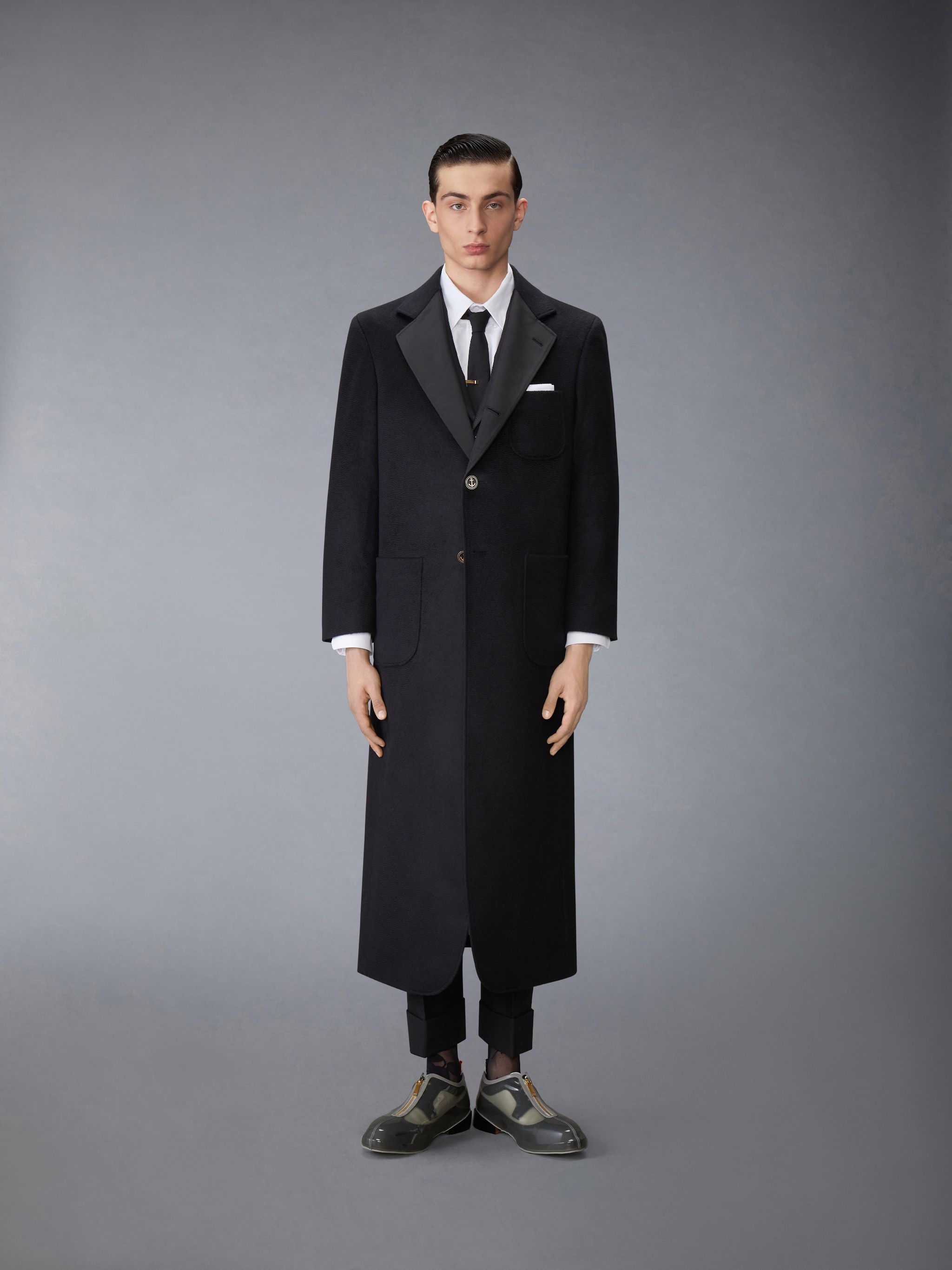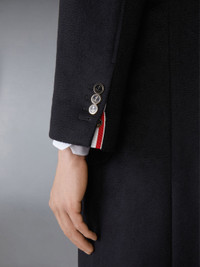 DETAILS & FIT To craft this one-of-a-kind piece, Thom drew inspiration from the late French caricaturist Georges Goursat, also known as "Sem," who often depicted the social elite. With its fine cashmere fabric and elegant length, this luxurious overcoat looks as if it's been pulled from the pages of one of Sem's drawings. Embrace grandeur this season. Front button closure 3 Patch pockets Single back vent with button closure Buttoned cuffs with signature striped grosgrain trim Interior pocket with name tag Tricolor stripe lining Signature striped grosgrain loop tab Model is 6' 1" (185cm), wearing size 0 100% Cashmere Combo1: 100% Silk Lining: 100% Cupro Made in Italy MOR113C-05387-001