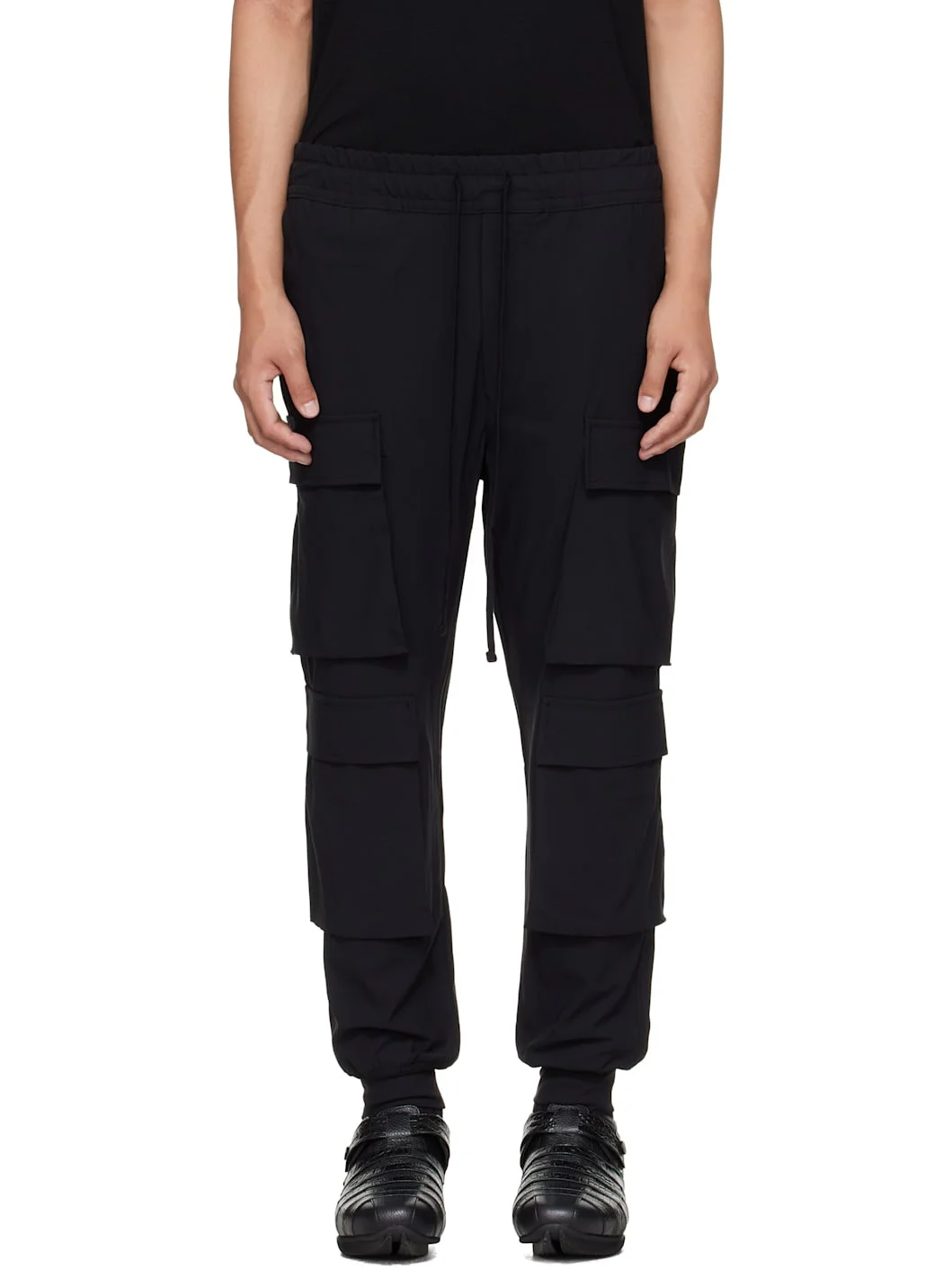 Crinkled nylon taffeta cargo pants. · Slim-fit · Drawstring at elasticized waistband · Four-pocket styling · Button fly · Cargo pocket at front legs · Zip pocket at front leg · Elasticized cuffs Supplier color: Black 100% polyamide. Made in Portugal 252974M188003
