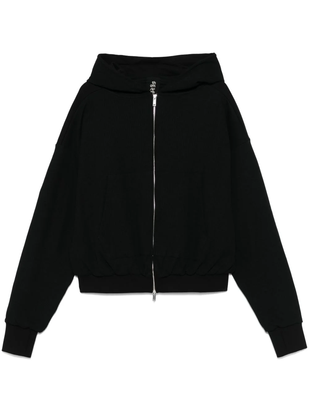 drop-shoulder hoodie Highlights - Black - Front two-way zip fastening - Classic hood - Long sleeves - Two front pouch pockets Imported Composition Lining: Cotton 100% Outer: Cotton 97%, Elastane 3% SIZE & FIT Model measurements Height 6 ft 0 in(1.84 m) Bust/Chest 35.82 in(91 cm) Hips 37 in(94 cm) Waist 28.34 in(72 cm) FittingInformation Designed to be unstructured, offering a loose fit throughout Made from a midweight fabric
