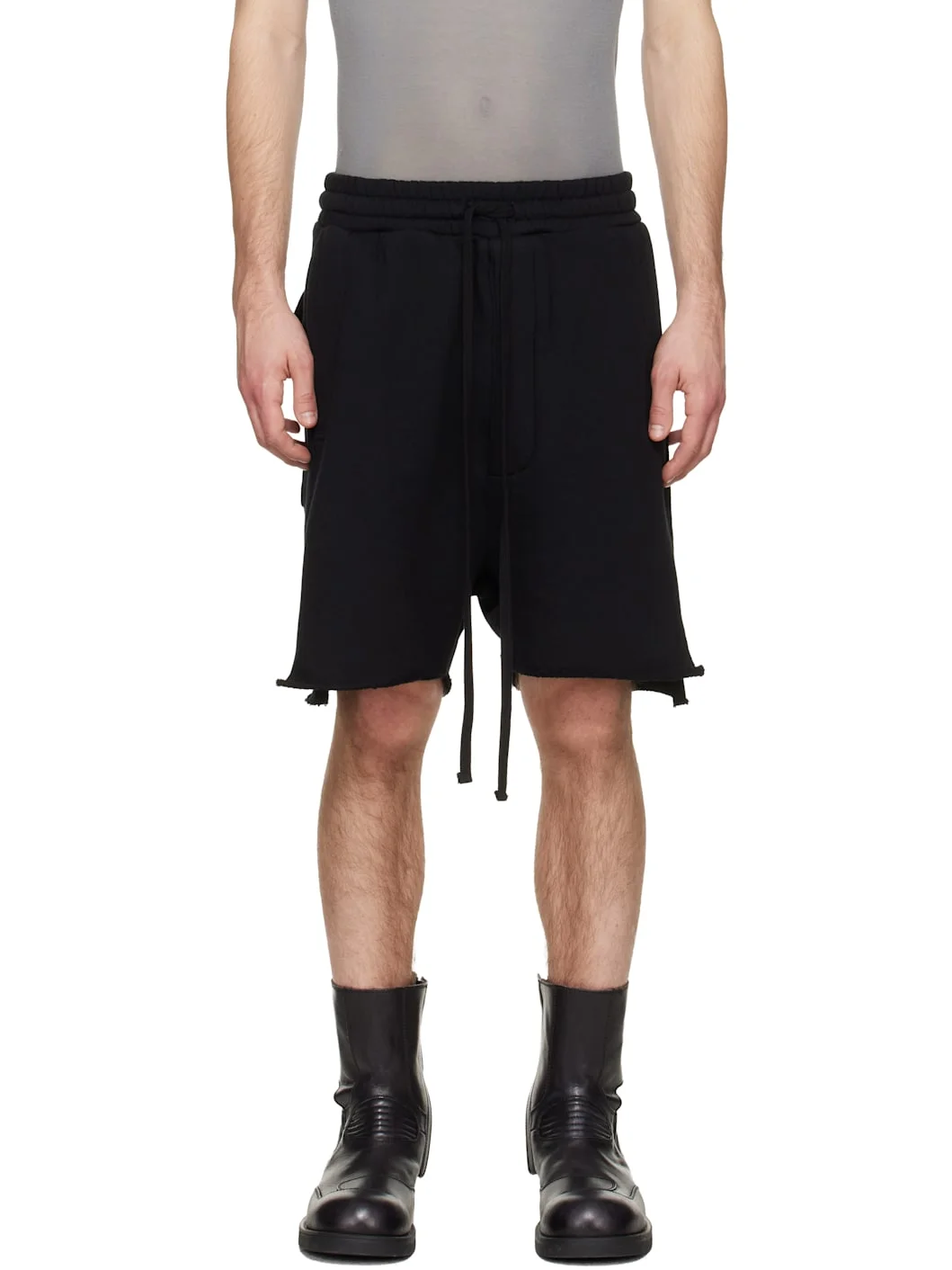 French terry shorts. · Drawstring at elasticized waistband · Four-pocket styling · Button fly · Raw edge at vented cuffs Supplier color: Black 100% cotton. Made in Turkey 261974M193000