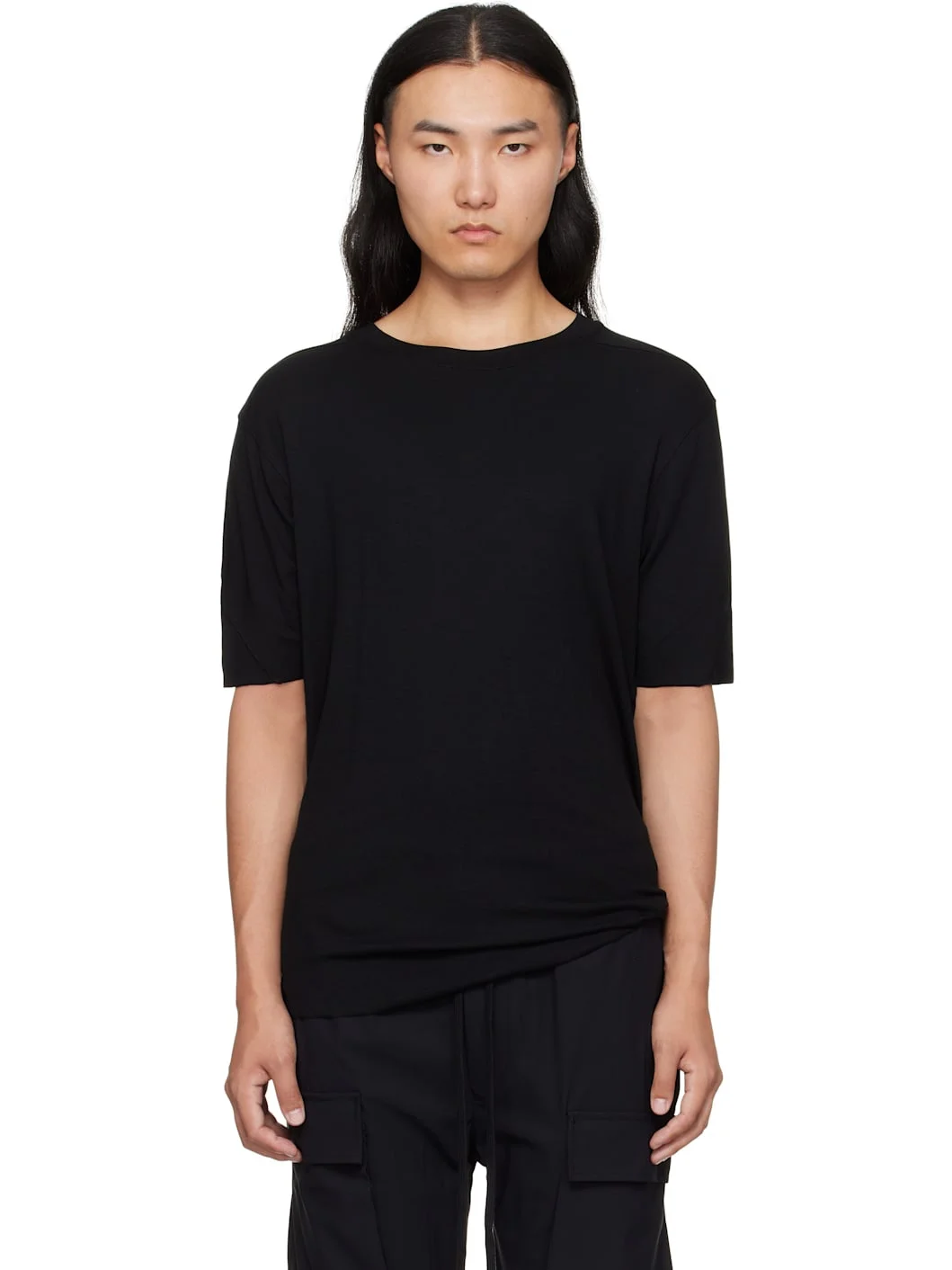 Stretch viscose jersey T-shirt. · Rib-knit crewneck · Raw edge at hem and cuffs · Logo embroidered at back Supplier color: Black 95% viscose, 5% elastane. Made in Turkey 252974M213021