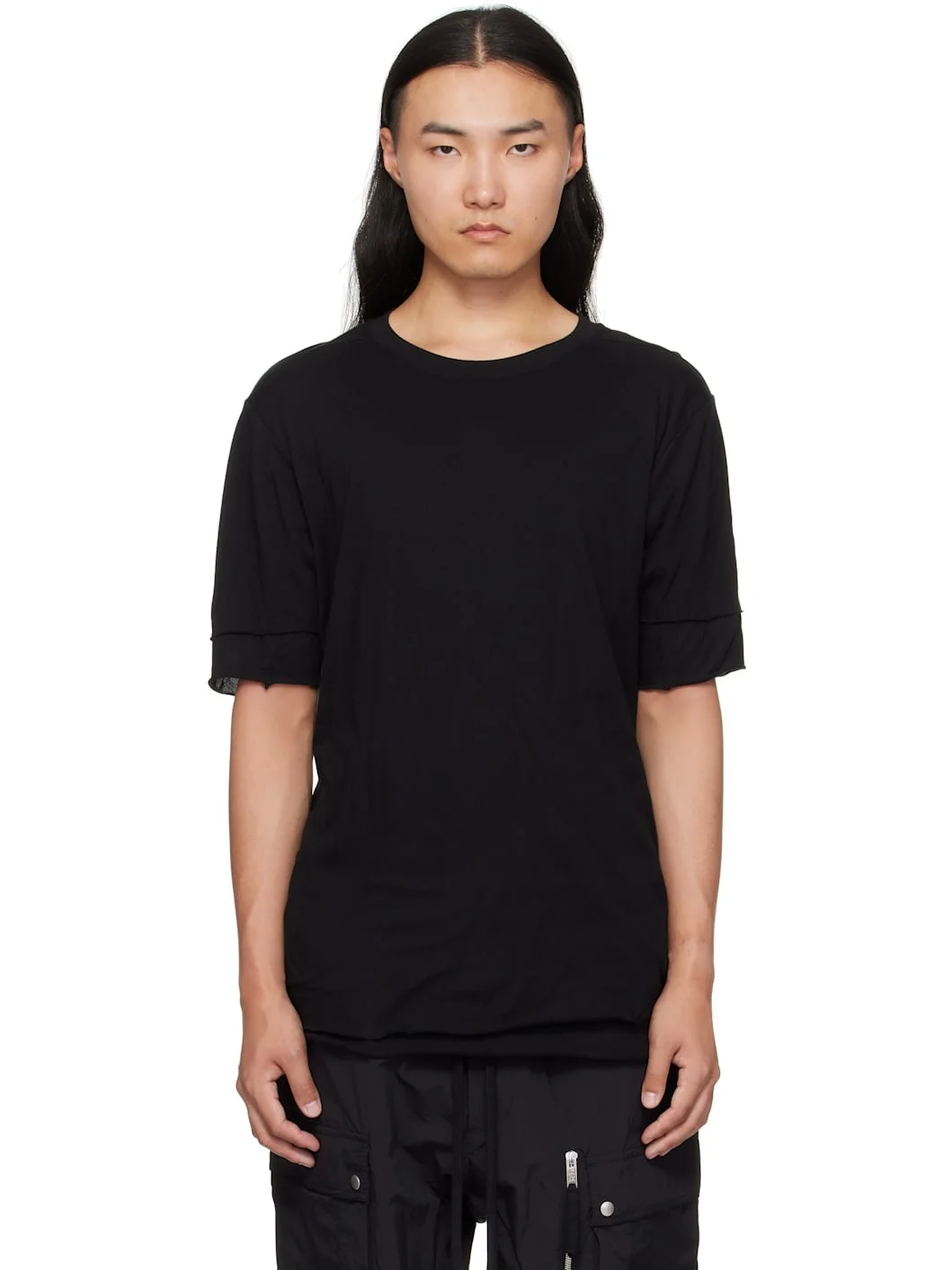 Cotton jersey T-shirt. · Rib-knit crewneck · Raw edge at layered hem and cuffs · Logo embroidered at back Supplier color: Black 100% cotton. Made in Turkey 252974M213017