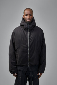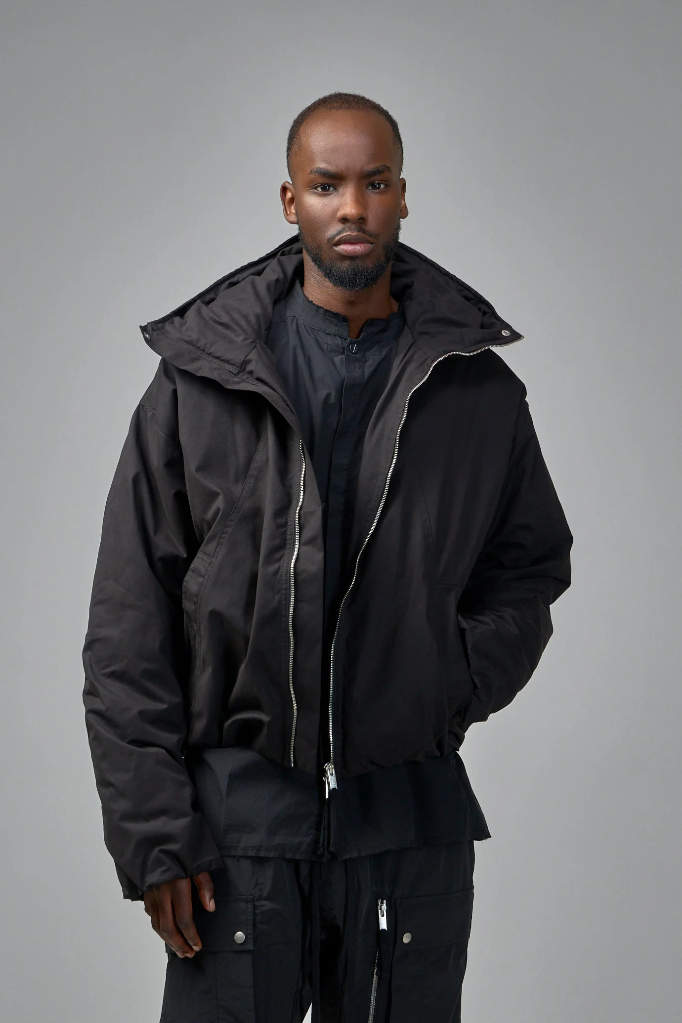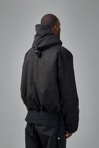 Bomber jacket with an oversized, boxy silhouette and attached hood. It has a double-ended silver zipper, side welt pockets, elasticated hem and cuffs, plus an adjustable buckle strap at the back of the hood. Materials: 38% Cotton, 52% Polyester, 10% Polyamide Color: black SKU: 151417 Brand style: M J 74 Size and Fit The model is 1.89m (6.2ft) and wears a size L. The item has a looser cut but is not necessarily oversized. It’s intended for a comfortable and easy wear.