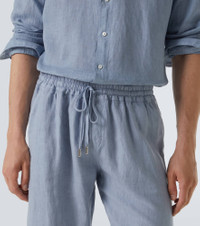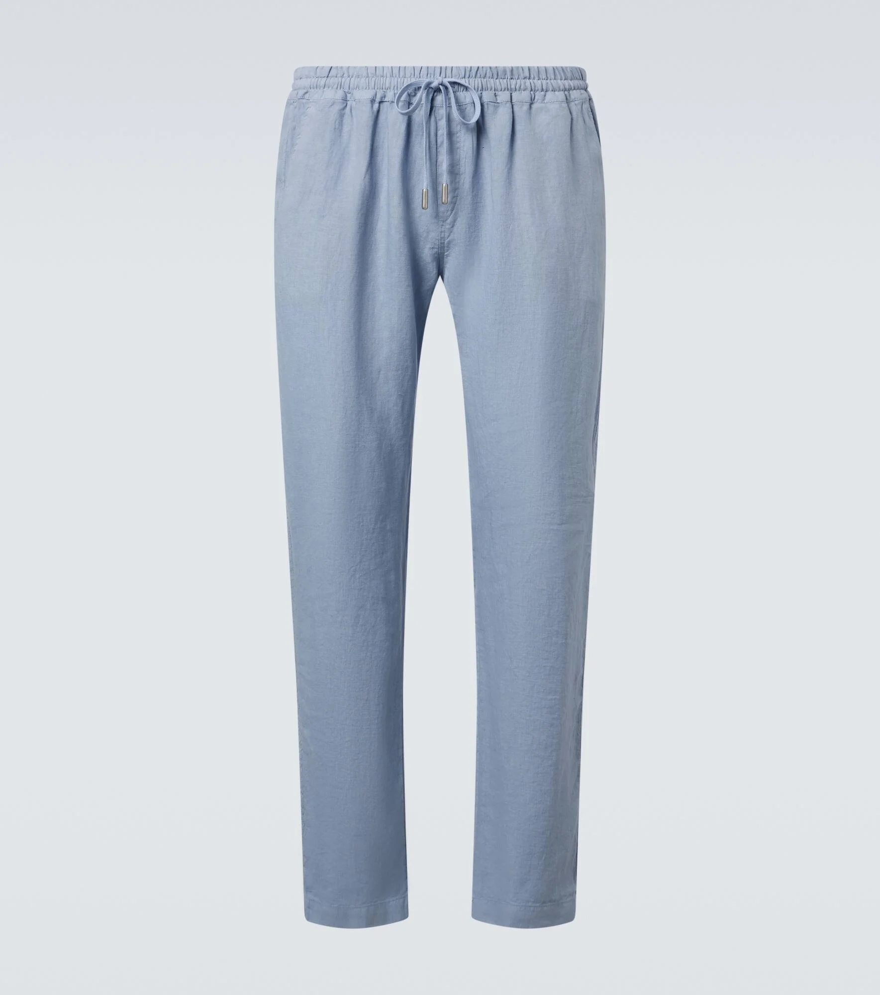 Made in Italy, these linen straight-leg pants from Thom Sweeney offer effortless elegance. Designed with an elasticated drawstring waist, they feature side slit and back pockets, blending comfort with timeless tailoring. Product Details - Material: 100% linen - Care instructions: hand wash - Made in Italy - Designer color name: Denim - Item color: blue - Elasticated drawstring waist - Pockets: side slit pockets, back pockets - Item number: P01034692 Size & Fit - True to size - Non-stretchy fabric - Slim-leg - Height of model is 189cm-74.5" and wears a size L