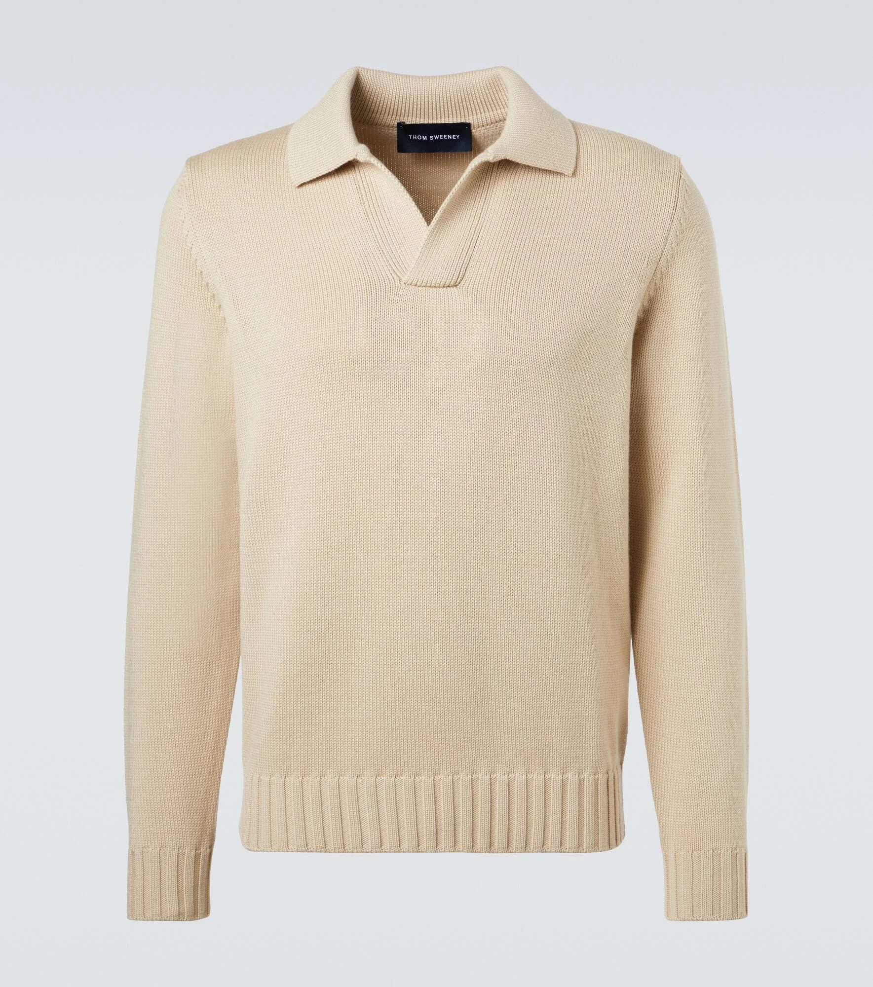 This sweater from Thom Sweeney makes for a polished addition to your everyday rotation. The style is knitted from Merino sheep's wool with ribbed trims and a polo collar. Product Details - Material: 100% wool (merino wool) - Care instructions: dry clean - Made in Italy - Designer color name: Oat - Item color: beige - Collar: polo collar - Cuff: ribbed - Hem: ribbed - Item number: P01076514 Size & Fit - True to size - For a looser fit, we recommend taking one size up - Slim fit - Slightly stretchy fabric - Falls to the hip - The model in the picture is 185cm-6'1" and wearing a size L