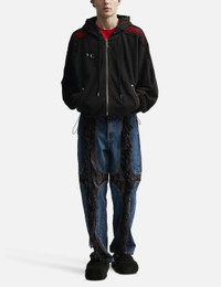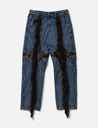 - THUG CLUB - Mohican Leather Denim Pants - Washed denim fabric - Zip fly - Faux leather panels with fringes at front and rear - Two side pockets; two rear pockets - Straight leg - Color: Blue - Country Of Origin: KR - Material: 100% Cotton - See more Jeans and Clothing SIZING - Model wears size 2 - Model measures: Height 186cm, Chest 35”/89cm, Waist 30.5”/78cm, Hip 35.5”/91cm