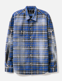 - THUG CLUB - Arab Sword Flannel Shirt - Allover checked flannel - Oversized fit - TC emblem on chest - TC snap button - 5 sword embroidery detail - Spray detail - Buttoned cuffs - Inner pocket - Curved hem - Lined - Color: Blue - Country Of Origin: KR - Material: 65% Polyester, 33% Rayon, 2% Spantax; Lining: 65% Polyester, 35% Cotton; Sleeve Lining: 100% Polyester - See more Shirts and Clothing SIZING - Model wears size 2 - Model measures: Height 186cm, Chest 35"/89cm, Waist 30.5"/78cm, Hip 35.5"/91cm