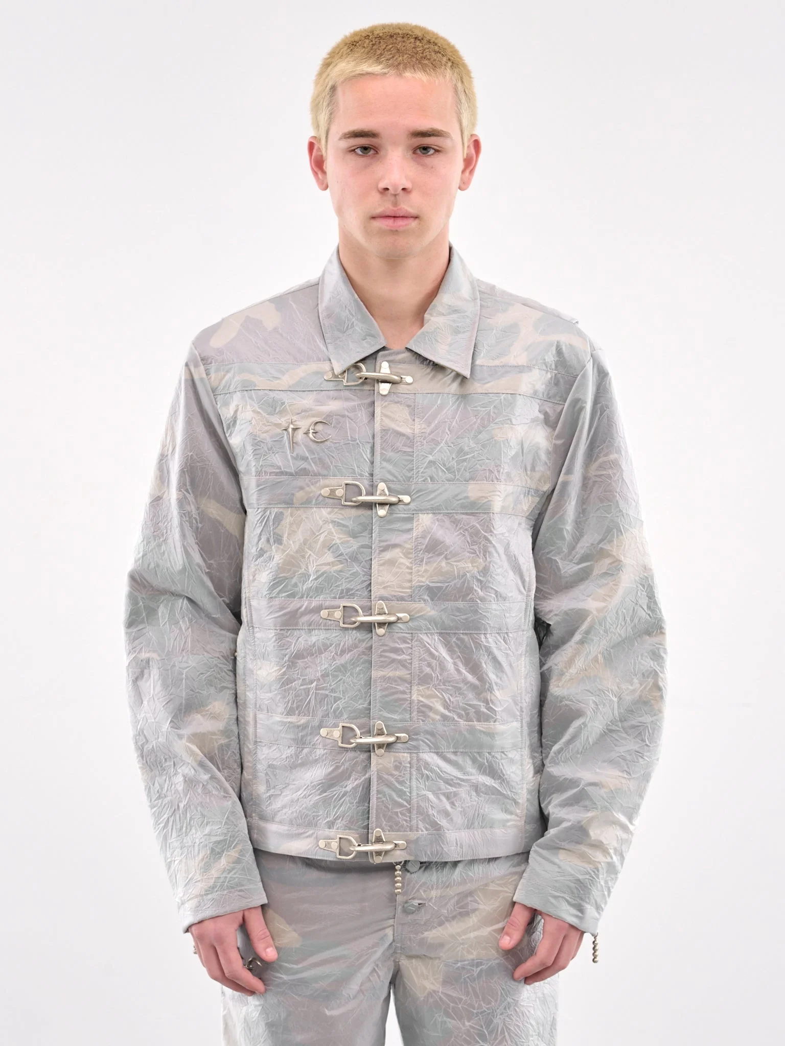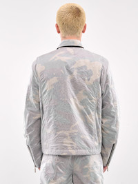 THUG CLUB jacket in grey, layered construction, underlay camouflage pattern, sheer overlay, spread collar, front fireman clasp closure, long sleeves, zip vent cuffs, chest metal logo plaque, side welt pockets, straight hem, lined, relaxed fit. Made in South Korea Fabric 1: 100% Nylon Fabric 2: 80% Polyester 20% Cotton Numeric Sizing Model is 6'0" wearing size 3. Shoulders: 18" Chest: 36" Waist: 28"