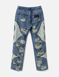 - THUG CLUB - Moon Star Distressed Denim Jeans - Washed cotton denim fabric - Button fly - 5 pocket style - Heavily distressed details - Straight leg - Color: Blue - Country Of Origin: KR - Material: 100% Cotton - See more Jeans and Clothing SIZING - Model wears size 2 - Model measures: Height 188cm, Chest 36"/92cm, Waist 30"/76cm, Hip 37"/94cm