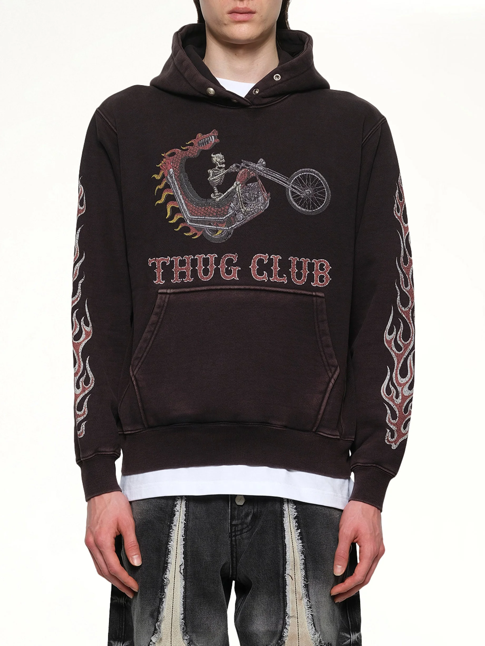 Thug Club's Dragon Chopper Hoodie in Black is a bold statement piece that combines streetwear aesthetics with intricate design. Perfect for those who want to stand out, this hoodie offers both comfort and style. - Composition: Cotton 100% - Features a striking dragon graphic on the back. - Adjustable drawstring hood for a customizable fit. - Kangaroo pocket for convenient storage. - Ribbed cuffs and hem for added comfort. - Available in various sizes for the perfect fit. - Made in: SOUTH KOREA Model is 187 cm and wears size 2 SKU: TC25SS2002