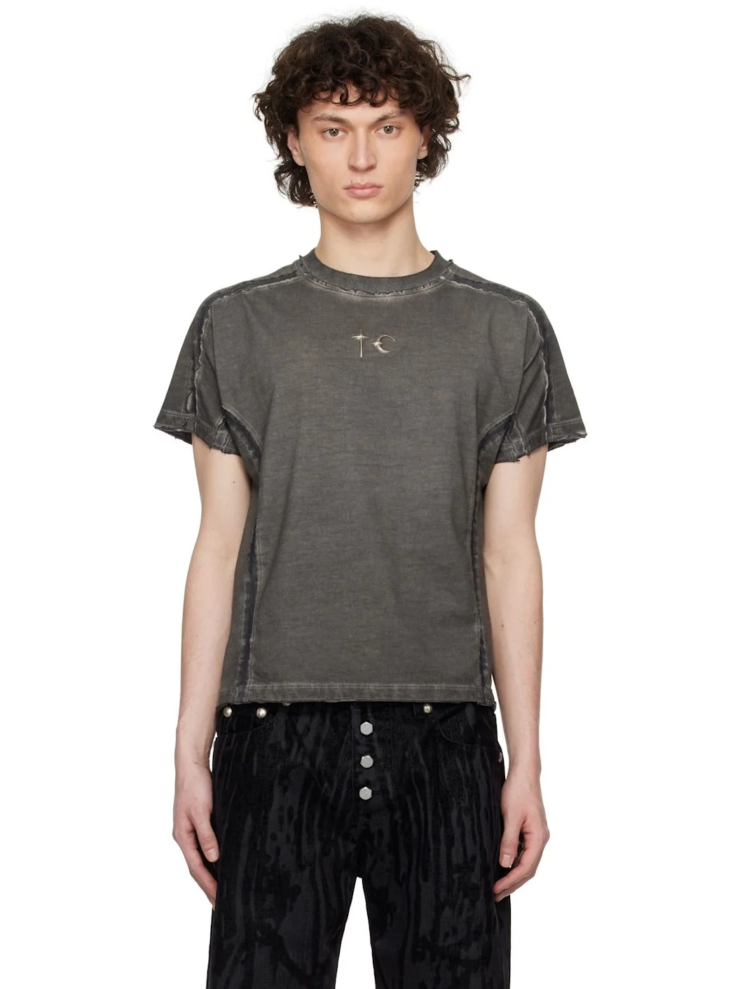 Garment-dyed cotton jersey and stretch polyester mesh T-shirt. Fading and raw edges throughout. · Paneled construction · Rib-knit crewneck · Logo hardware at chest · Dolman sleeves · Logo embroidered at back Supplier color: Charcoal Body 1: 100% cotton. Body 2: 88% polyester, 12% polyurethane. Made in South Korea 251220M213010
