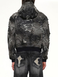 Hard-Washed Damaged Denim Hooded Zip-Up in Black