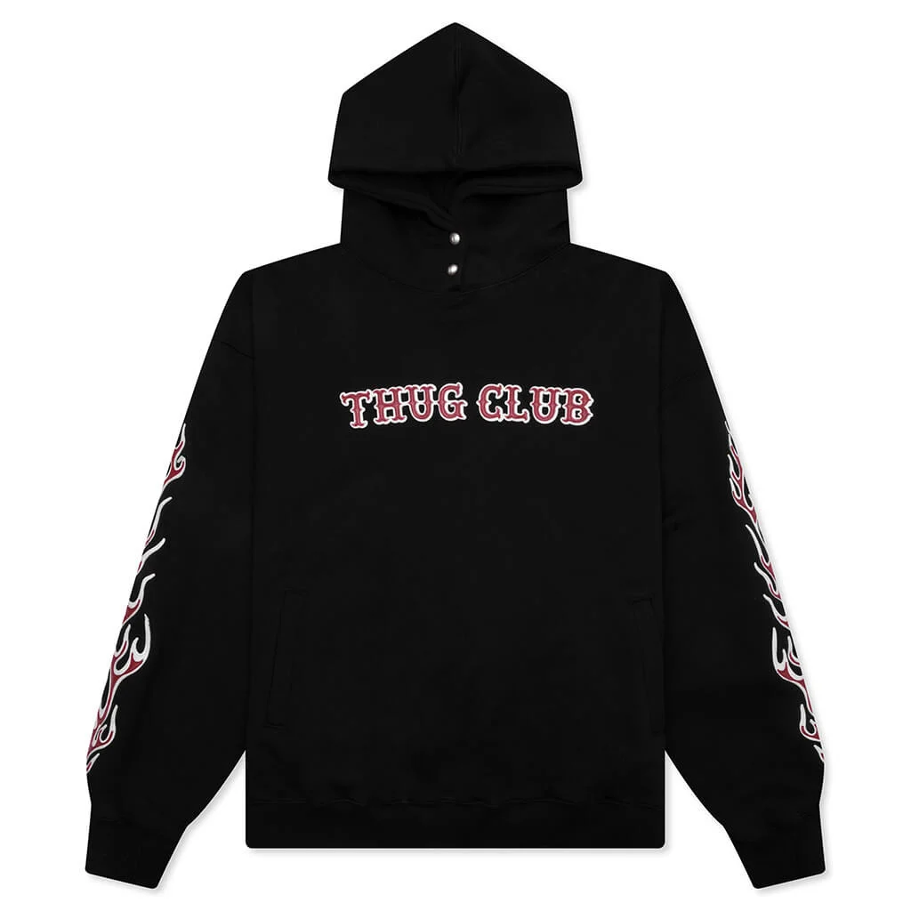Introducing the Leather Flame Hoodie from Thug Club. Constructed from heavyweight cotton, this hoodie is cut to have an oversized fit. Featuring a fixed hood with custom snap buttons, side-entry pockets, and ribbed cuffs. Leather graphics are stitched intricately across the chest and sleeves for standout details. - 100% Cotton - Heavyweight - Oversized fit - Fixed hood with snap buttons - Leather graphics - Side-entry pockets - Ribbed cuffs - Style No: TC25SS2201