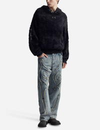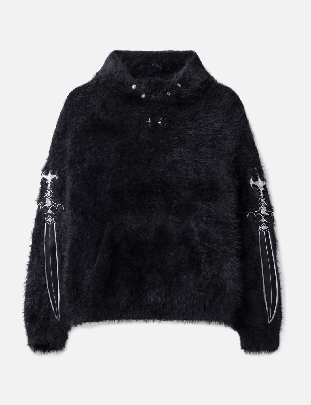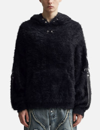 - THUG CLUB - TC Logo Fluffy Hoodie - Fuzzy polyester fabric with a natural stretch - Hooded with snap buttons at collar - Metal logo detail at center - Embroidered sword graphic on both sleeves - Color: Black - Country Of Origin: KR - Material: 100% Polyester - See more Hoodies and Clothing SIZING - Model wears size 2 - Model measures: Height 188cm, Chest 36"/92cm, Waist 30"/76cm, Hip 37"/94cm