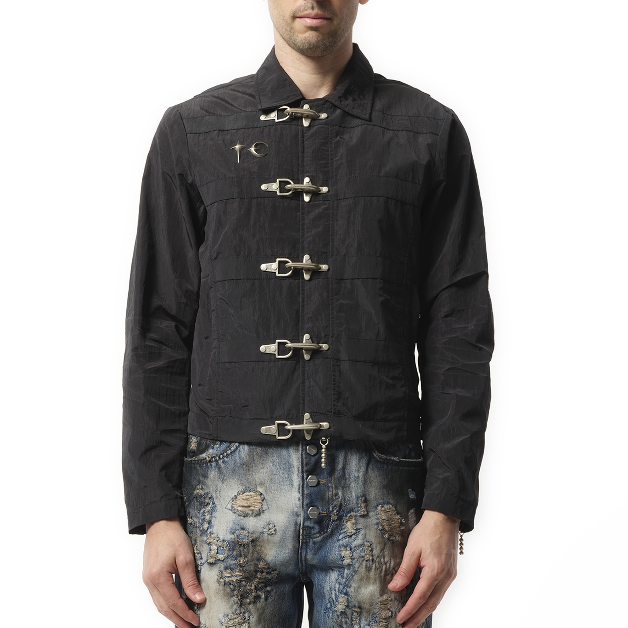 Thug Club's Scarred Bio Soldier Jacket in Black delivers a bold, tactical-inspired look with distressed detailing. Designed for versatility, this statement jacket combines structure with an edge. - Composition: 100% Re-Nylon/100% Polyester - Relaxed fit - Front zip closure - Distressed and scarred detailing - Made in South Korea Model is 192 cm and wears size 2. SKU: TC25JK0302