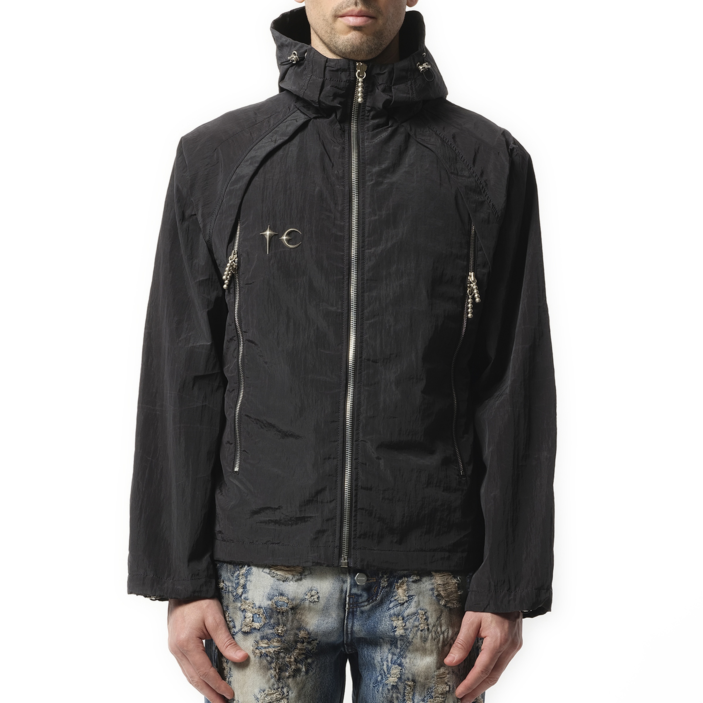 Thug Club's Scarred Wind Soldier Jacket in Black combines durability with a rugged, military-inspired look. Featuring a modern, structured fit and high-quality materials, this jacket offers both comfort and style, perfect for your everyday wardrobe or outdoor adventures. - Composition: 100% Re-Nylon/100% polyester - Full-zip front with buttoned cuffs - Wind-resistant for added protection - Subtle logo detailing - Made in South Korea Model is 192 cm and wears size 2. SKU: TC25JK0102