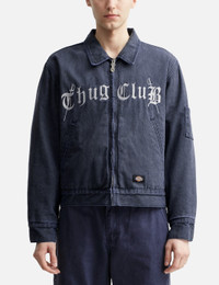 - THUG CLUB - TC Eisenhower Jacket - Thug Club x Dickies collaborative collection - Vintage washed cotton denim fabric - Lightly padded - Zip closure - Embroidered logo at front and rear yoke - Dickies logo above hem - Two front pockets; one interior pocket - Snap button cuffs - Quilted lining - Color: Navy - Country Of Origin: KR - Material: 100% Cotton - See more Jackets and Clothing SIZING - Model wears size 2 - Model measures: Height 186cm, Chest 34”/86cm, Waist 28”/71cm, Hip 36”/91cm