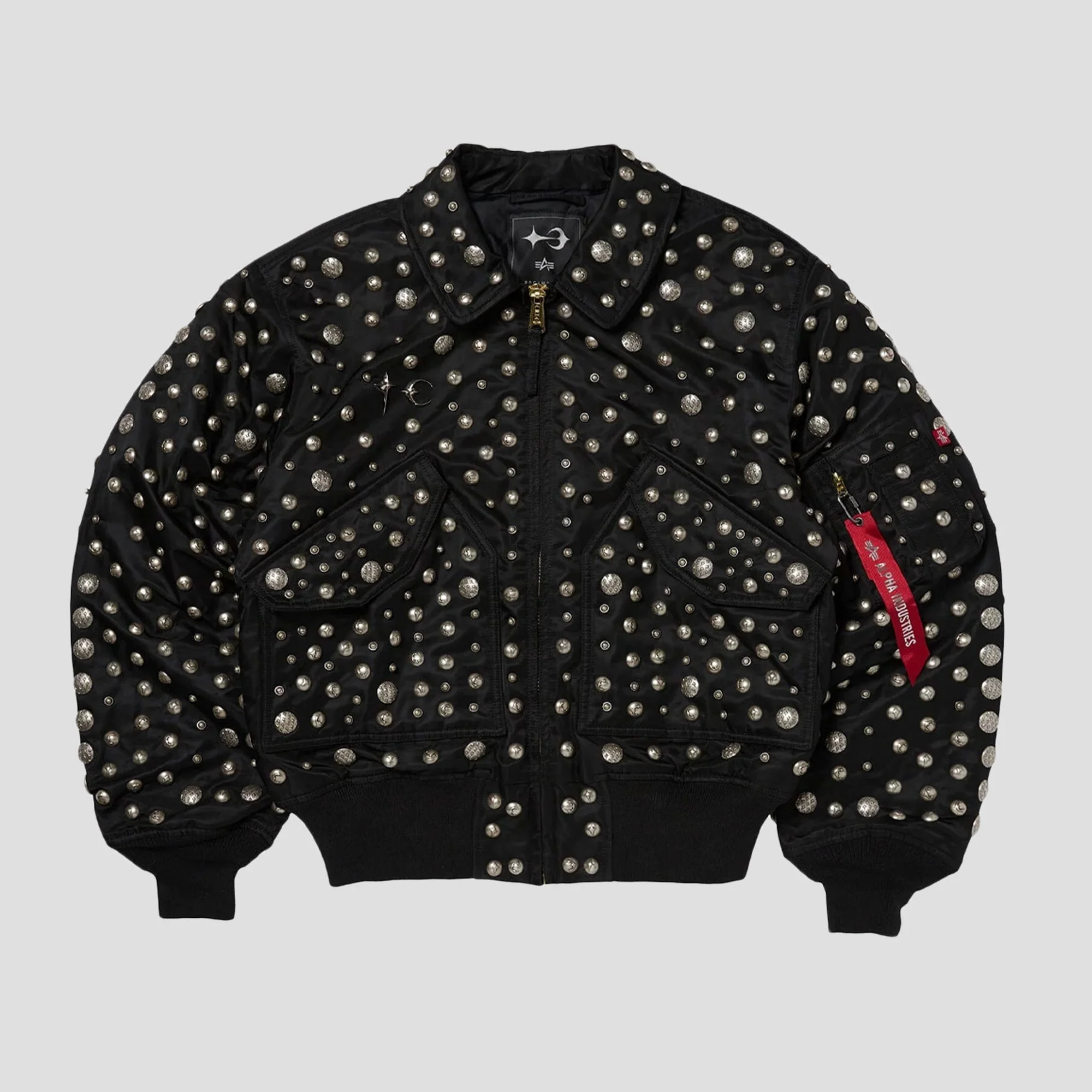The THUG CLUB X ALPHA CWU 45/P ALL OVER RIVET VERSION features alloy metal studs and handmade rivets covering a CWU 45/P Flight Jacket body. BENEFITS FEATURES FABRICS & CARE - Water resistant