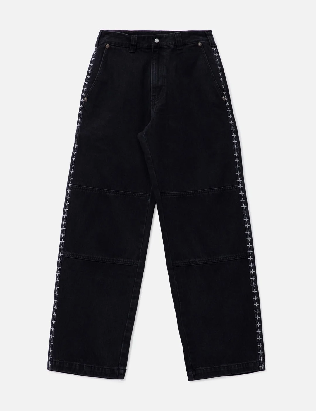 - THUG CLUB - X Stitch Pants - Thug Club x Dickies collaborative collection - Durable cotton denim fabric - X stitch details on outer leg seams - Zip flly - Two side slant pockets; two rear pockets - One small pocket at leg - Double knee details - Straight leg - Color: Black - Country Of Origin: KR - Material: 100% Cotton - See more Pants and Clothing SIZING - Model wears size 2 - Model measures: Height 186cm, Chest 34”/86cm, Waist 28”/71cm, Hip 36”/91cm