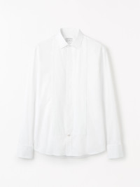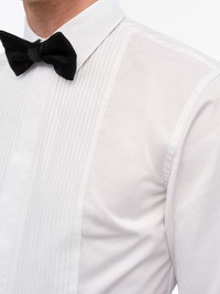 Al is a refined tuxedo shirt, featuring a pleated plisse bib for a classic, elegant touch. Designed with a semi-spread collar, hidden placket, and French cuffs, it balances timeless sophistication with modern tailoring. Cut in a slim fit based on our Adley block, it offers a sharp, streamlined silhouette ideal for formal occasions. Product Details - 100% Organic Cotton - Tuxedo shirt with plisse bib, based on Adley fit - Semi-spread collar - Festive/formal - Hidden placket - French cuffs - Includes removable knotted cufflinks - Sewn plastic buttons - Back L: 79 cm - Curved hem - Made in Romania - Model is 186 cm and wearing a size 40 - For a complete look, wear it with Tenuta Tuxedo Trousers and Nuptone Shoes - Art No.113754090