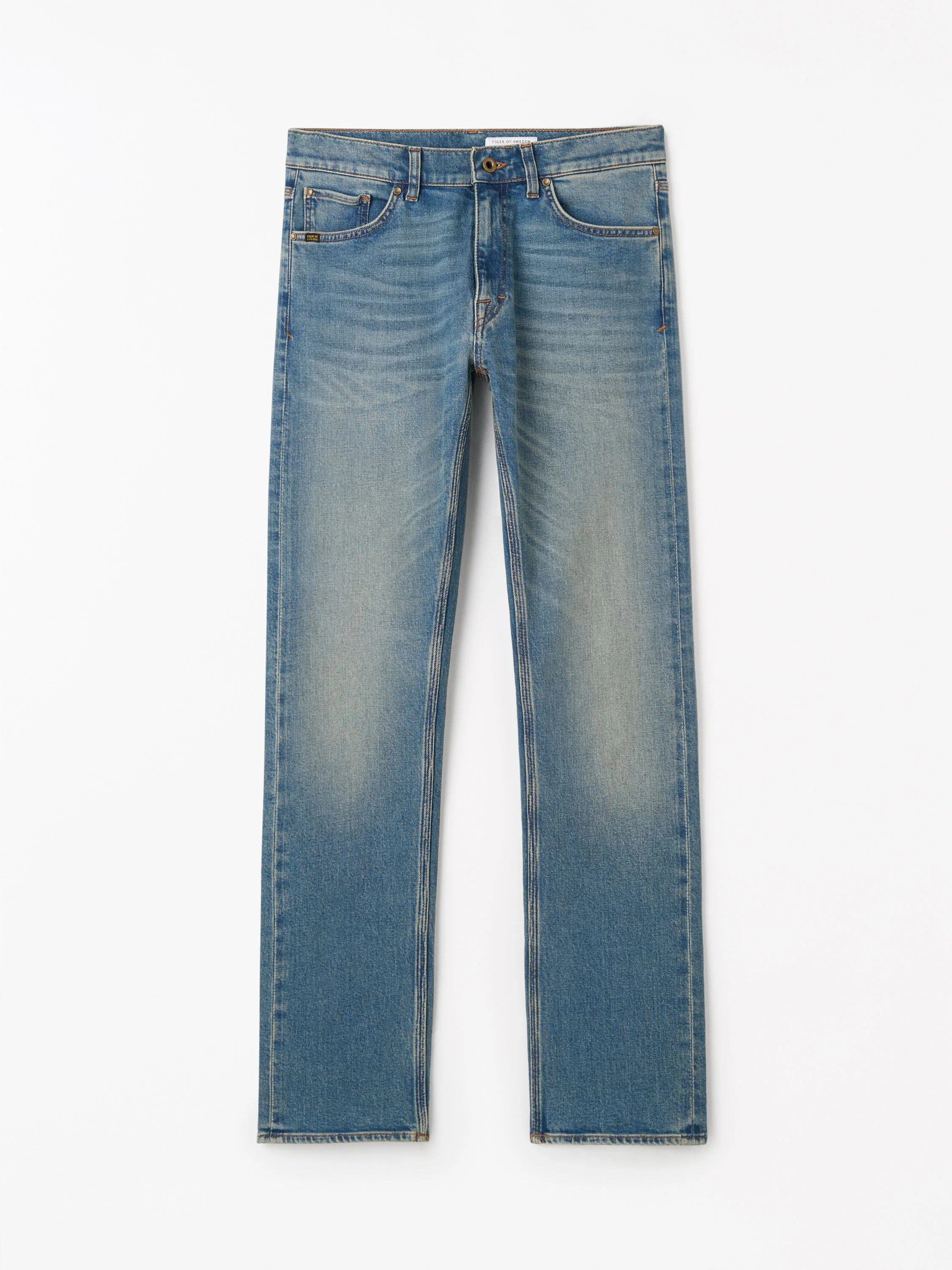 The Des jeans are our slim-straight fit, crafted from comfort stretch denim for ease and flexibility. Featuring a mid-rise waist and a straight leg, they offer a modern silhouette. Thoughtful details include triple stitching, a branded patch, and a classic five-pocket construction with a coin pocket. Product Details - 79% Cotton, 20% Cotton Recycled, 1% Elastane - Mid-rise fit in comfort stretch - Triple stitching, branded patch - Five pocket, coin pocket - Straight leg - 32 = 80 cm - Echo wash - Made in Tunisia - Model is 188 cm and wearing a size 30 - For a complete look, wear it with Wilde Sweater and Cienci Sneakers - Art No.11360921F
